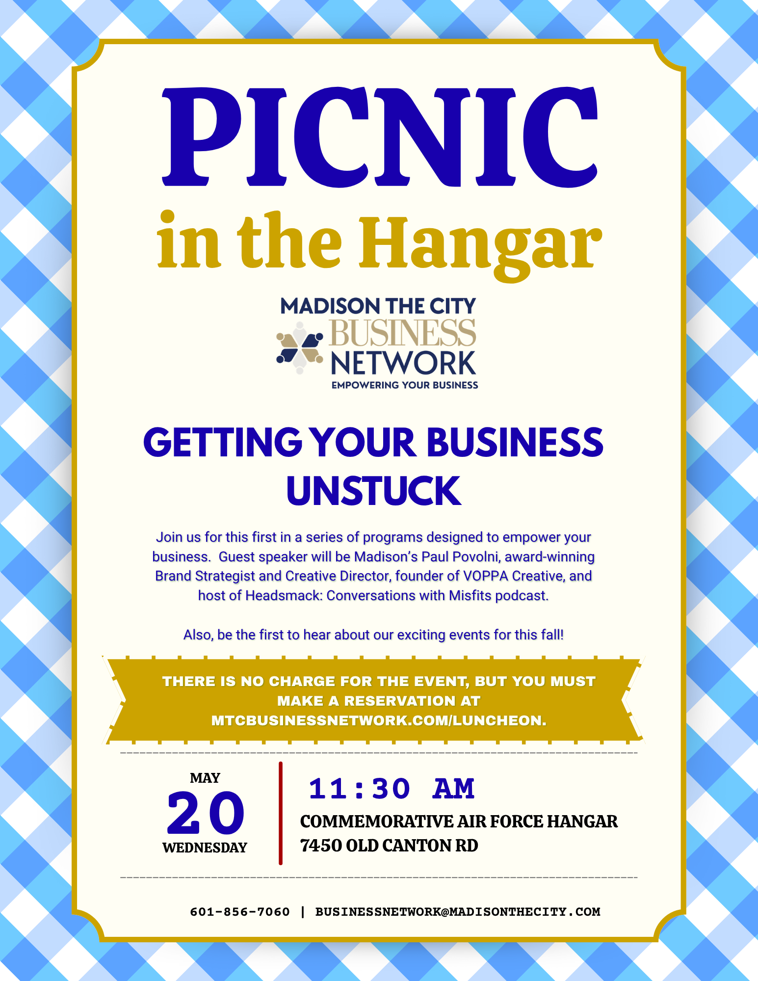 Business Network members and guests are invited to a Picnic in the Hangar on May 20 at 11:30 am for our Quarterly Luncheon. The setting will be the Commemorative Airfare Hangar at 7450 Old Canton Road where history takes flight. Our topic will be “Getting Your Business Unstuck,” the first in a series of programs on how to empower your business. Guest speaker will be Madison’s Paul Povolni, award-winning Brand Strategist and Creative Director, founder of VOPPA Creative, and host of “Headsmack: Conversations with Misfits” podcast.