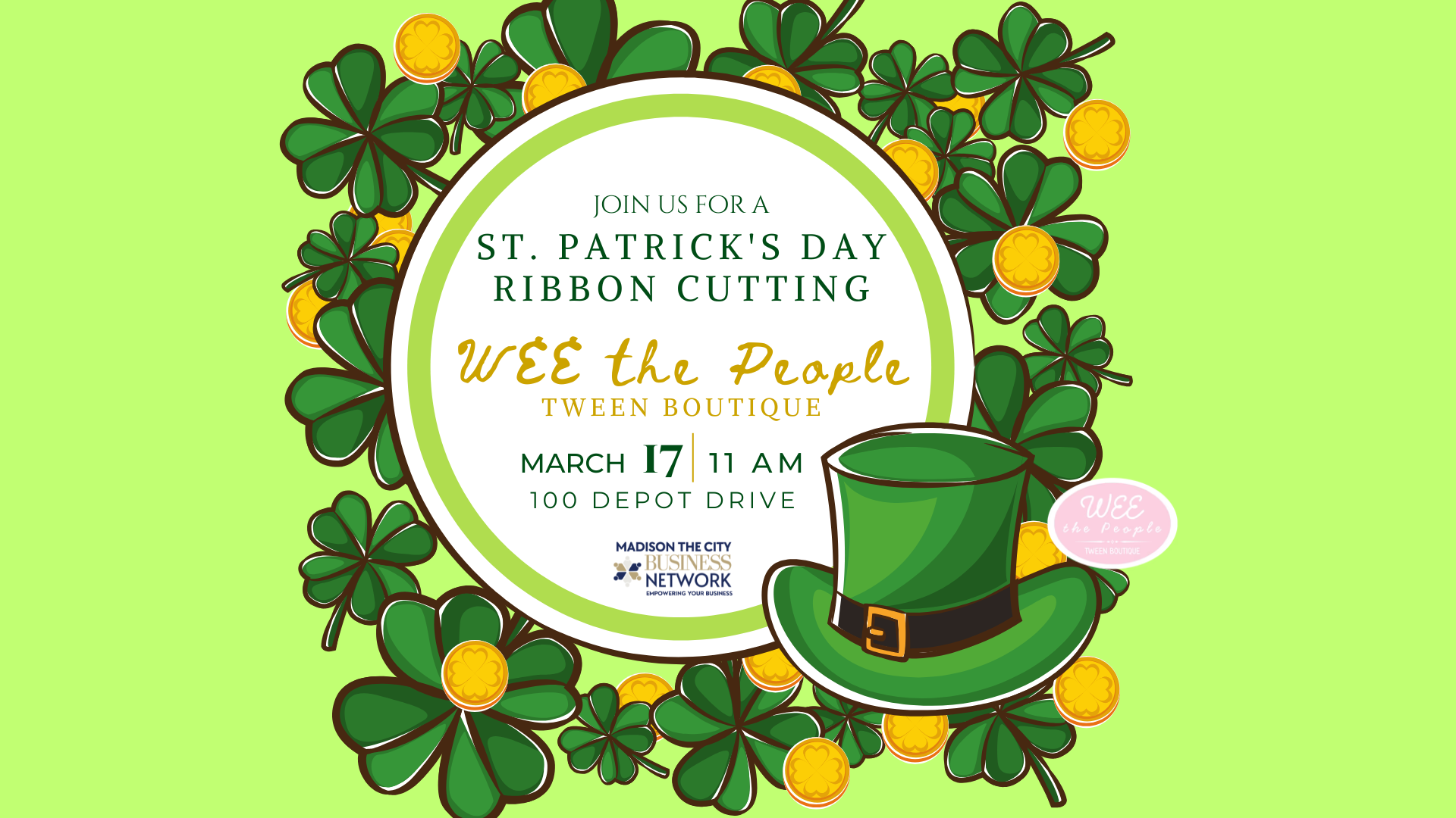 Celebrate St. Patrick’s Day by joining us for the Ribbon Cutting for Wee the People at its new location at 100 Depot Drive at 11:00 am on March 17. This Tween Boutique offers clothing, accessories, shoes, pajamas, athletic wear, and gifts.