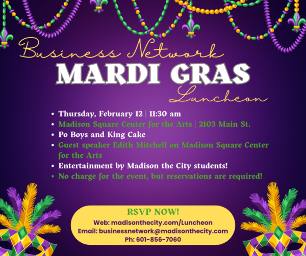 Business Network members, please join us for the February Mardi Gras Luncheon at 11:30 am on Thursday, February 12 at the Madison Square Center for the Arts. Enjoy Po Boys and King Cake, hear about the new programs at the Center, and be delighted by the entertainment from students in our Madison the City high schools. There is no charge, but you must make a reservation.
