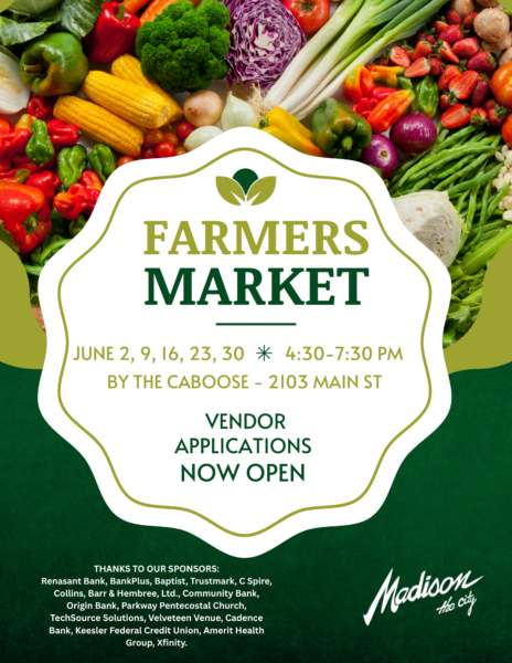 Vendor Applications for the 2026 Farmers Market are now available. You may either print out this two-page PDF file, complete it, scan it, and email it to tbecker@madisonthecity.com or complete the online form below.